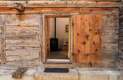 This traditional Swiss hut offers a cosy studio room which includes a kitchen, a table with barstools and a lounge area with armchairs. The bathroom is ajdacent. The 1,60 cm double matrace is "maisonette-style" and reachable with a ladder from the living room, therefore not suitable fo people who struggle with mobility. There is modern pellet oven, perfect to relax after a long day of skiing..