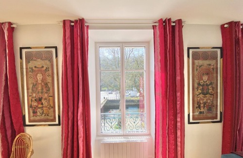 this luxury 100m² apartment is located on the first floor with an elevator in a beautiful building at the heart of the historic center, uniquely positioned along the odet docks It features high-end decor, including masterpiece paintings, a multimedia system with high-quality sound, various music CDs, and a beautiful library.