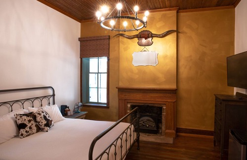 andy designed this boutique hotel similar to the original three suites on the square with influence such as american indians, spanish explorers, mexico and texas cattle baron with his signature modern bling.