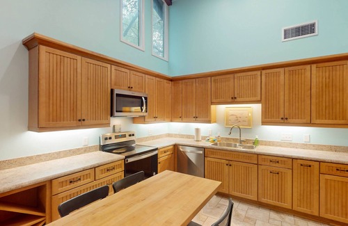the house features a large cathedral ceiling great room and dining area with bar area and a large fully equipped, eat-in kitchen with a portable indoor grill There are three bedrooms including a spacious primary with a king bed and walk-in closet, 1 queen with double closets and 2 twin beds with double closets. Each bedroom as is equipped with charging stations for phones. If your family includes little ones, one of the twin beds has a convertible bed rail attached. Also available is an infant Pac and Play which can be used as a crib and a small play pen. There are 2 and ½ baths (1 full bath with tiled walk-in shower and 1 full bath with shower/tub combo). It also features a family game room equipped with an 8-player card table (playing cards and poker chips included), a kid sized 4 seat table and chairs and stocked with a variety of age appropriate games and puzzles, as well as a full screen tv and dvd player. There is a small study with a queen sofa sleeper, tv and dvd player, as well as 2 bookcases stocked with a wide variety of reading materials. This room opens into the back yard, which has outdoor seating for 6, a small grassy play area and a 3-hole putting green. Just outside of the kitchen is a small paved area with a gas grill. There is also a laundry available with a full-size washer/dryer, iron and ironing board. There is no parking in the garage, however, the double-wide driveway will easily accommodate 4 cars.