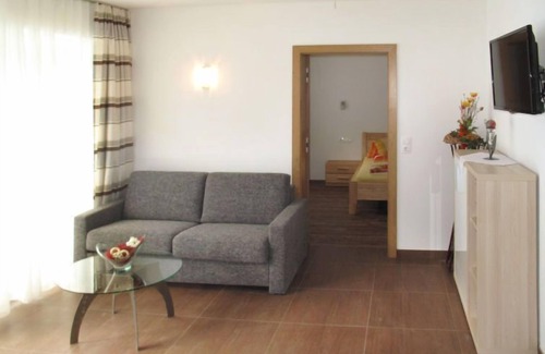 "leonie", 2-room apartment 60 m2, on the ground floor Beautiful furnishings: living/sleeping room with 1 double sofabed, dining nook and satellite TV (flat screen). 1 room with 1 double bed and shower/WC. Kitchenette (oven, dishwasher, 4 ceramic glass hob hotplates, toaster, kettle, microwave, electric coffee machine). Underfloor heating. Parquet floors. Terrace partly roofed. Terrace furniture. Facilities: children's high chair, baby cot. Internet (WiFi, free). Please note: non-smokers only. When there are less than the maximum number of guests staying at the property, not all of the housing units will be available for use.