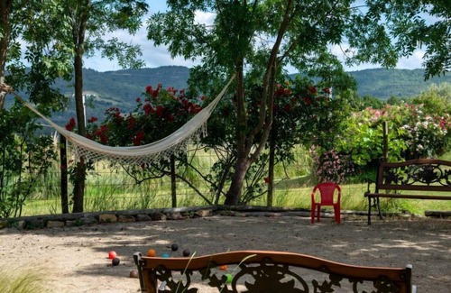 Le Hameau de Vendemies 3 km from Limoux: Old stables including a main one storey building and a tower on 2 floors, completely renovated in 2003-2004, Oriental style (Alhambra mosaics), in a very quiet position, on a hill overlooking the meadows and fields. Single-family house "Les Ecuries". Outside the resort, in the countryside. For shared use: boccia. Private: natural garden 5'000 m2 (fenced), swimming pool angular (12 x 4 m, depth 150 - 150 cm, seasonal availability: 01.Jun. - 30.Sep.) with internal staircase. Terrace (120 m2), parking on the premises, single garage. Shop 3 km, grocery 3 km, restaurant 3 km, café 3 km, bus stop "Gare de Limoux" 6 km. Nearby attractions: Cité de Carcassonne 32 km. Please note: car recommended. horses, a donkey and sheeps nearby. A refrigerator was installed near the pool .