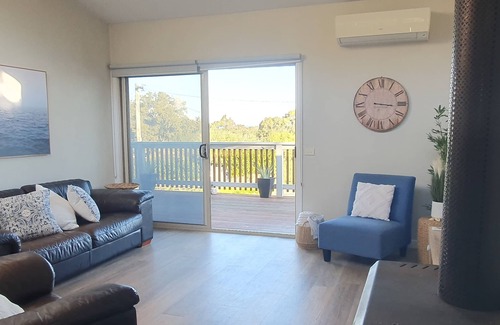 Listen to the waves break on the Spacious deck at "Turf&Surf". Lovely 3 bedroom house with a light modern coastal appeal. Open plan living with wood fire. Enjoy walking to the Lakes Entrance Golf Course and teeing off alongside the magnificent 90 mile beach. Enjoy walking to the Eastern Beach or the secluded Lake Bunga Beach. Just a short 4 minute drive, or take a lakeside walk into town where you can explore everything Lakes Entrance has to offer..