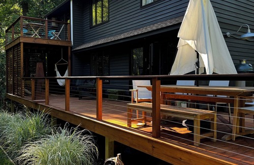 truly made for indoor/outdoor living and entertaining, there are several furnished areas on the wraparound deck including a covered seating section, a dining area, ping pong table, lounge chairs and an outdoor kitchen with both gas grill and a green-egg bbq Indoor and outdoor sound systems round out this well pointed home.