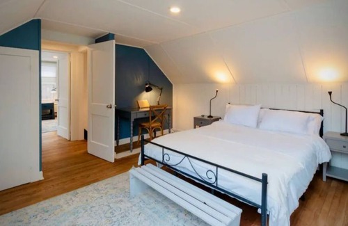 this home has two bedrooms and can accommodate up to 4 guests comfortably The rooms are on the second floor, providing independence from the living space. The expertly designed bedrooms feature sober minimalist colors, plentiful windows, high-end linens, and locally inspired artwork. Each bedroom is designed to reflect the natural beauty and give guests a comfortable place to unwind. Our bedrooms are designed to be perfect for kids or adults, with exceptionally comfortable beds and plenty of space. Main bedroom has a comfortable working station.