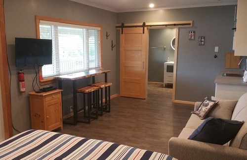 fully furnished, with linens, high speed internet basic cable tv and local phone included The suite has digitally controlled Air Conditioning/heat, a Queen and single sofa pullout bed. There is a kitchenette, bar fridge Coffee maker, toaster and a private 3 piece bathroom. Min 2 night stay. 1 dog (under 50lb), No cats please!.