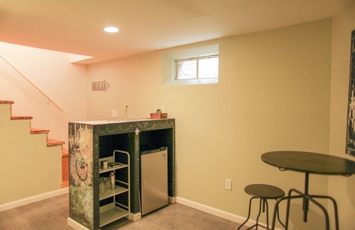 there are 3 bedrooms and two full bathrooms in this three level home The first floor has a modern chef's kitchen with dishwasher and a fabulous stove. The living room has a gorgeous wood burning fireplace. The master bedroom has a huge king size bed and connects to the modern bathroom which is fully redone. Soak in the giant tub as you stare out into the lush woods- heaven!! The second bedroom has a queen size bed. Downstairs, in the finished basement, you'll find a pool table for game time, a library, a bar area with a mini fridge to stock your beers, and a Moroccan lounge with a record player so you can sit back and lounge. The third "Indian Zen" bedroom also contains a queen size bed. There is another full bathroom with a shower and a laundry room with full size washer and dryer.