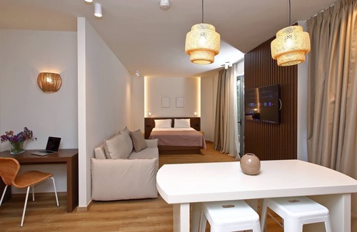 Local Suites, situated in Nea Moudania, Chalkidiki, offer guests a modern and comfortable retreat. They are located on the first floor and provide an elevator.The suites feature a new and luxurious interior and are equipped with air conditioning, televisions and kitchenettes, ensuring a convenient and enjoyable stay. Only a 35 min drive from SKG Airport, the suites provide easy access for travelers. The vibrant center of Nea Moudania is only 50 meter far away, offering a variety of cafes, shops and local attractions within a short walking distance. Additionally, the beautiful beach is just 600 meters away, making it easy for guests to enjoy the sun and the sea.