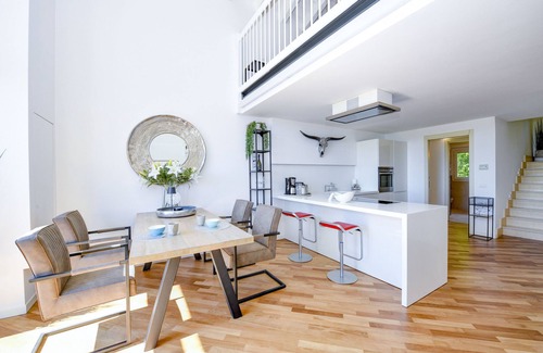 LA TORRETTA is a beautiful, high-quality gallery apartment on two floors (3rd and 4th), ideal for two people, completely renovated, furnished with love and offers abreathtaking lake view to Sirmione.Ideal for a relaxing holiday, home office with a fantastic view or an active holidaywith hikes or bike rides in the beautiful surroundings.A riding stable is also in the immediate vicinity.The bright apartment is accessible via an elevator.A large pool is available all year round, including two sun loungers and a parasol.The residential complex is very well maintained, in a quiet location.The front door takes you into the large living room with a closed wardrobe,large L-couch, large flat screen TV (with international programs) and soundbar,a large dining table (200 x 90), fully equipped kitchen with oven, four ceramic hobs, fridge with freezer compartment, dishwasher, coffee machines (German coffee machine and Nespresso), kettle and toaster.From the living room you can access the cozy south-facing balcony with two rattan armchairs including cushions, a small table and an electric sun awning.With a view over the well-kept complex, the beautiful pool, the olive grove to Lake Gardayou can enjoy your breakfast in the morning sun or your evening Aperol Spritz with a view of the twinkling lights.Behind the kitchen there is a small hallway with a closet equipped with:Cleaning utensils, ironing board and iron, as well as a drying rack.Through the hallway you reach the completely renovated bathroom, equipped with:Sink, shower, toilet, bidet and washing machine, make-up mirror with magnifying anda hair dryer. The large mirror is provided with indirect LED lighting, which is equipped with aRemote control can be controlled individually.A stone staircase takes you to the walk-in closet on the mezzanine floor.If necessary, you will find a cordless vacuum cleaner there.Further down the stairs you reach the study on the left, with a work table,a comfortable sofa bed and a great view over the gallery to the complex with pool.Next to it is the bedroom with a double bed (high quality mattress 170 x 200), flat screen TV with soundbar and shelves.From the bed you have a breathtaking view of the lake.If you prefer to sleep in the dark, you can draw the lightproof curtain.The entire apartment is equipped with stable WiFi and German/Italian sockets, as well as air conditioning in all rooms for cooling or heating.The residential complex in which the apartment LA TORRETTA is located is just outsidefrom Puegnago del Garda - idyllically located in the olive grove - between Manerba and Salò.Lake Garda and the Rocca di Manerba, probably the most striking rock on the south-west of Lake Garda,can be reached in 10 minutes by car.Supermarkets, bakers, butchers, cafes and restaurants are in the immediate vicinity.A wonderful place to feel good, relax - for DOLCE VITA on the beautiful Lake Garda.It is strictly forbidden to charge the electric car with the house electricity.the accommodation is for a maximum of 2 people including infants. We never accept more people than 2..