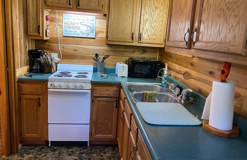 the downstairs consist of a fully furnished kitchen- laundry room, one bathroom, living- dining room combination and a locked storage room Musky Cabin has musky decor throughout and handmade railing from tier poles in an old tobacco barn from the farm I grew up on!.