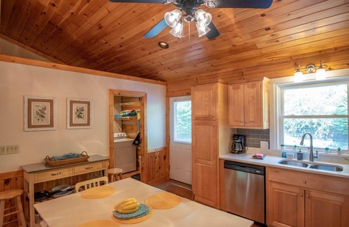 the vaulted rooms (including the bedrooms!) are light and airy, and we love the stylish decorating with a mix of modern farmhouse and a few well-chosen antiques An open floor plan means your guests and family will be with the cook while watching television or socializing around the fireplace. Wood floors reflect the natural light.