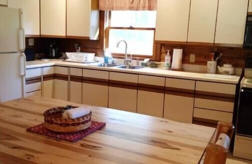 the cabin has an open concept with a loft overlooking the common area There are two private bedrooms on the first floor and a full bath. The kitchen includes everything needed to make a meal. There is a coffee bar with Keurig & K-cups supplied. Appliances included are refrigerator, stove, microwave, toaster, crockpot, and air fryer. Also dishes, pots, pans, drinking glasses, cooking utensils, etc... The deck has picnic table with benches and chairs and grill. There are USB ports in the Kitchen to plug your charging cords into..