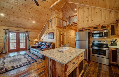 welcome to cherokee ridge cabin, where cozy cabin comfort, scenic mountain views, and vacation-worthy amenities combine for the mountain getaway of your dreams! this 2 bedroom, 2 bath home with 2 levels is almost too good to be true Mountain views delight and are viewable from the great room’s double glass doors that open to the covered, full-length porch. You'll feel your cares melt away in the porch's Hot Tub, breathing in the views and the clean mountain air. The cabin seamlessly blends its wood interior and high-end custom cabin décor with modern amenities such as high speed, fiber optic internet, internet TV with Roku, and a game room with a "bar box" full-size pool table, foosball, and ping pong. A full-home generator makes sure the fun doesn't end due to weather - you'll still have water and electricity (even for the hot tub). There's plenty to do, and plenty of ways to enjoy the mountain views while creating memories to last a lifetime. You’ll love gathering around the wood-burning fire pit. Or see the views and relax on the NEW, large lower deck with custom chairs, ambient lighting, and a gas fire pit perfect for swapping stories around. just 15 minutes from downtown murphy’s restaurants, shops, and activities, cherokee ridge cabin has everything you’d want for the mountain vacation of your dreams!