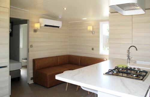 you will be staying in a modern and cosy 3-room mobile home that spans an area of 35 square meters The living/dining room features a dining table, TV, and air conditioning for your comfort. One bedroom is equipped with a double bed measuring 160 cm wide and 190 cm long, while the other bedroom has two beds, each 80 cm wide and 190 cm long. The open kitchen is well-appointed with a dishwasher, four gas rings, a microwave, a freezer, an electric coffee machine, and Senseo capsules for your convenience.
