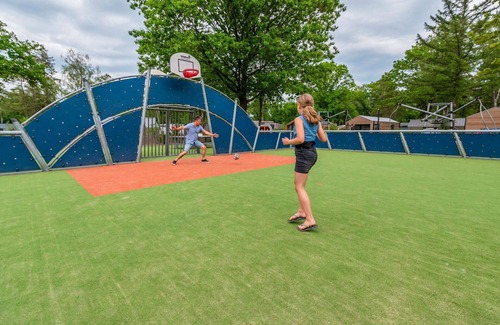 europarcs de hooge veluwe is a vacation rental located 8 km from the center of arnhem, netherlands The property boasts a natural setting with trees, meadows, and a pond, along with amenities like a swimming pool, indoor pool (seasonal availability: July 1 to August 31, open from 9:00 AM to 4:00 PM), and facilities for boccia and children's playground. It offers a reception area, restaurant, sauna, fitness room, infrared sauna, trampoline, shopping facilities, and a shared washing machine (extra charge). Parking is available, albeit with a limited number of spaces, and an EV charging station is provided.