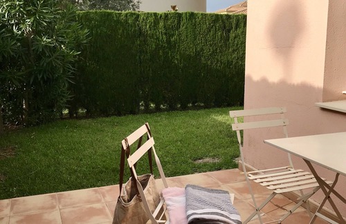 Charming villa with two bedrooms and two bathrooms with private garden, 100 meters from one of the best beaches in the Mediterranean, next to the golf course in Oliva Nova Beach & Golf, luxury resort between Gandía (Valencia) and Denia (Alicante) . the resort between the sea and the mountain has a golf course, tennis courts, paddle tennis, soccer, spa, fitness and one of the best equestrian centers of the international circuit (met), restaurants, supermarket, pharmacy, cafes, in an exclusive environment and calm