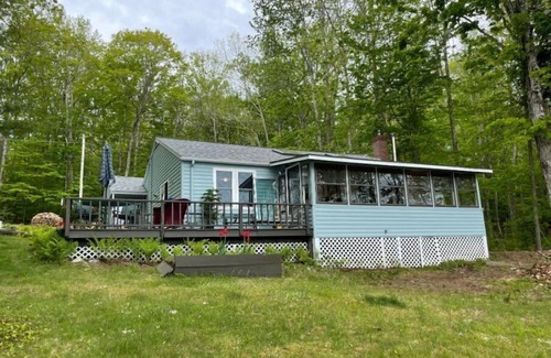 Bluebell cottage is full of Mid-Century rustic Maine charm, artfully decorated! There are 2 bedrooms, 2 full baths, great for families and dog friendly. The vaulted ceiling living room is open to the fully stocked kitchen. The newly renovated enclosed porch has 6 large picture windows overlooking the pond, a twin bed for napping and wicker seating for lounging. Step into Maine with this private home nestled in the poetic mid-coast woodland, on one of the most beautiful and inviting ponds. The kitchen, dining, living and main bedroom have majestic water views. The bedrooms have new pine floors, and fresh bright and cheerful decor to lift your spirits. You can listen for loon calls in the morning, go fishing from the private dock or take a paddle board out to the island. Kayak or canoe around the 53 acre pond. The water warms up nicely for swimming. The deck also overlooks the pond, great for a peaceful cup of coffee in the morning, with a propane grill, wood fired grill and dining area for 6 guests. Come enjoy s'mores over the fire pit to welcome the evening! The mountain behind the cottage has endless hiking trails, including the ski slopes with ocean views. Camden and Rockport harbors are a 10 minute drive away.
