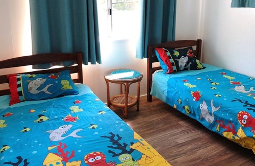 the main bedroom has a double bed, second bedroom has two single beds and the third bedroom has two single beds