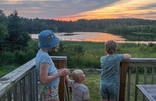 the newly renovated cottage is filled with art and musical instruments, espresso machine, soaker tub, private dock, and the beach is just 60 metres from the front door Watch the bluenose set her sails twice a day from the front deck. We are tucked into Puffy Cup Cove where she moores and takes guests out to sea on day trips (be sure to book! Or whale watching or deep sea fishing!) With 360 water views of the Atlantic in the front and Masons Pond in the back, have your coffee as the sunrises over the Atlantic and a sunset cocktail on our small private dock on Masons Pond. This quiet seaside community is peaceful and unique.