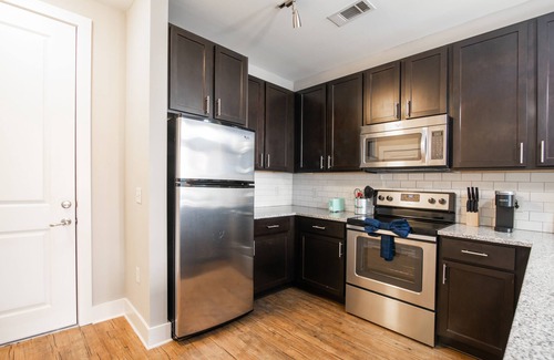 our modern 1 bedroom suite is fully equipped with all you’d need for a comfortable long term stay if you choose The kitchen is fully stocked with cookware, stainless steel appliances and a Keurig for fresh coffee. Our High speed WiFi can be used with the Smart Roku TV including apps like Hulu, Prime, and Netflix to name a few! Enjoy the freedom of signing in using your login credentials to watch all your favorite shows! Take pleasure in stepping out on the private balcony to relax or work on your laptop while taking in the fresh outdoor air. Free covered parking available . Full Sized Washer/Dryer located inside of unit. This location couldn’t get any better being only 5 Miles from Uptown and the CLT City Center..