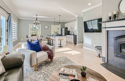 the main level boasts an open kitchen, wood-burning fireplace, half bath, and a spacious dining area for 8 Smart TV, laundry, and comfy seating are also provided.