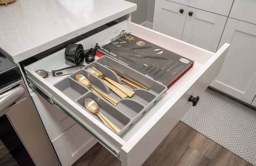 as you enter each condo, you’ll be greeted by modern, updated living areas elegantly furnished with neutral colors and décor You’ll find comfortable living spaces perfect for rest and relaxation as well as gathering and entertaining. Plush sofas and smart TVs offer the ideal movie-watching destinations or quiet places for an afternoon nap. Each home includes a fully equipped kitchen with stainless steel appliances, Keurig coffee makers, cookware, and dinnerware. You’ll have all the convenience of making meals at home or preparing takeout from a fantastic local restaurant. Dining room tables for 2 are great for sharing meals or enjoying a game of cards.