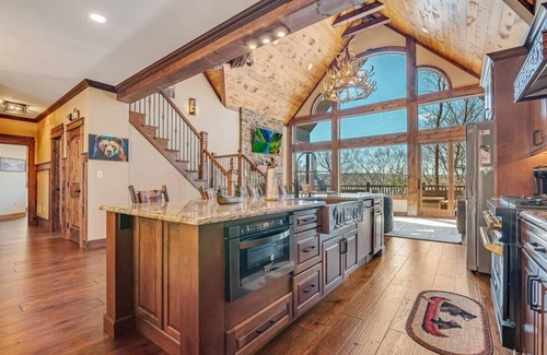 Black Bear Lodge promises vacationers a blissful and carefree experience from start to finish. Every moment will become a Wallenpaupack lake memory that you will treasure always. Centrally located in the Wallenpaupack Lake Estates community, you will be immediately charmed by your wooded surroundings. Step inside this spacious home to be greeted by gleaming hardwood floors, cathedral ceilings and massive wall of windows. Filled with natural light, the main level living area has an open layout that is ideal for spending time with family and friends. Get cozy by the gas fireplace in the great room to watch TV with the kids or to make a toast with that special someone. Make home-cooked meals in the well-equipped kitchen that features granite counters and stainless steel appliances. When it is time to dine, there is plenty of seating at the kitchen island and the table. Plus, sliding doors give you access to the deck for afternoon cookouts. The main level primary suite is a private haven furnished with a king bed and TV. Wood accents add a touch of warmth that creates the perfect ambiance for a mountain escape. Your private bath offers a dual vanity and roomy, tile shower stall. Upstairs, there are two more bedrooms, one with a king and one with two queen beds that share a bath. They are tastefully decorated with a good night's sleep in mind. You will awake refreshed and ready to tackle a fun day at the lake. For a fun evening at home, head to the lower level family room. Lots of seating options give everyone a good view of the wall-mounted TV when you want to watch football or a favorite movie. Enjoy telling "big fish" stories around the bar area or play arcade games on the two arcade machines. Two more bedrooms each with king beds and a full bathroom with massive walk in tile shower, round out this 5 bedroom luxury home. Each morning, you can sip coffee on the large deck as you contemplate your plans for the day. Enjoy meals with the family in the evenings and relax by the gas firepit or you can take a dip in the bubbling hot tub that is sure to relax.