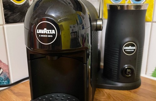 funky colourful kitchen with lavazza coffee machine and milk frother, built in oven, hob, washer/dryer, microwave, fridge freezer