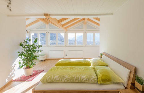 Embedded in the stunning landscape of Terlano in Bolzano, this gorgeous apartment in Villa Sonnenschein perfectly combines the charm of an alpine cottage with the luxury and conveniences of a modern, spacious home. The apartment, which integrates wooden materials with cream-coloured decor and colorful accents, occupies the first floor of the villa and consists of a light-flooded living/dining room, with ceiling-to-floor windows, a very well-equipped kitchen, 2 bedrooms with 2 en-suite bathrooms as well as one independent studio with a sofa bed and can therefore accommodate up to 6 people. Additional amenities include Wi-Fi, a fireplace, satellite television, a baby cot, a children's bed (both upon request) and a highchair. In the outdoor area, guests are invited to have their morning coffees or fresh meals on the private, furnished terrace, surrounded by panoramic mountain views, or to stroll through the lush garden during the colorful sunsets, which is shared with the residents of the lower floor. Nature lovers will enjoy the surrounding Adige valley for its beautiful apple plantations and find many hiking trails in the vicinity of the property. By car, guests can then reach the popular ski areas scattered throughout South Tyrol - Merano 2000, for instance, is about 25 km or a 26-minute drive away.