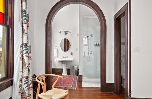 The Columbian Heights room is located in the Ludlow House of Summit Street Inns. It once belonged to Mrs. Ludlow and is a second-floor beauty with historically inspired décor and gorgeous stained glass windows that offer a view of Summit Street, St. Paul’s Episcopal Church and 5th Street. The stunning carved archway that leads into the bathroom is original to the home. The room offers carefully renovated accommodations with a comfortable, king-size bed, desk and private bathroom with sizable walk-in shower..