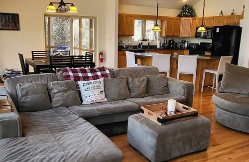 the chalet has a spectacular wall of windows, a cozy wood burning floor to ceiling stone fireplace, outdoor firepit, large deck with large propane grill, screened in porch with comfortable chairs and propane fire table to hang out and enjoy the outdoors, pool table / ping pong table / air hockey table, dart board, poker chips and 2 large smart tv's There is a Loft area which is great space to relax with a daybed and lounge chairs. The Loft also has a dedicated Office Space with desk, monitor, keyboard, printer, etc.