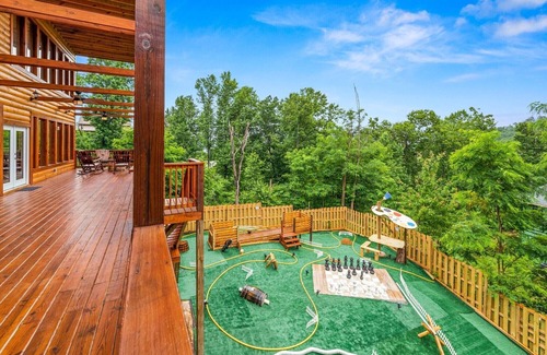 with a 28' x 12' salted water heated indoor pool with unique smokie's view from the pool to enjoy the views while inside the pool, hot tub, sauna, game room and theater room, this cabin getaway offers everything you need for a relaxing group getaway EXTERIOR PRIVATE MINI GOLF, GIANT CHESS, BOWLING LANE at the property. This cabin is located in a unique scenic view area. Peaceful mountain views await. Some great outdoor spaces include BBQ for cookouts on nice nights, FIRE PIT for s'mores and stories, a PAVED FLAT DRIVEWAY for easy arrivals that fit up to 6 cars and that fresh mountain air you've been craving. this cabin has it all!