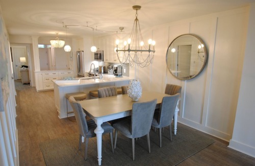 interiors coordinated by award winning design team - enjoy soft colors of gray mist and white vintage board and batten trim, arts and crafts doors and doorways and cutting edge colors, textures and fixtures Floors of easy care driftwood planks bring boardwalk coastal flair to every room. Walls gleam with soft light and showcase local art of mesmerizing beach landscapes. Easy dining at the kitchen bar or around the vintage table with comfortable soft gray ultrasuede chairs - you'll linger long after every meal.