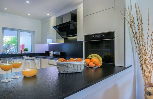the kitchen is fully equipped with appliances such as dishwasher, hob, fan assisted oven, washing machine, fridge freezer, microwave, kettle, toaster, iron and ironing board, saucepans and cooking utensils, fully fitted units and window overlooking heated swimming pool and garden