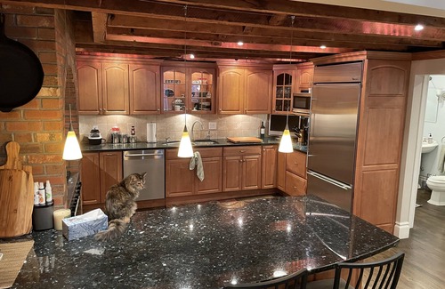 on the lower floor you will find an open floor plan with a large living area featuring a high-end home theatre system with 7-speaker surround sound recessed into the ceiling and 55" flat screen hdtv In addition, a full custom chef's kitchen and large dining table which seats 8 people comfortably. The kitchen has professional grade stainless appliances, including a 48-inch professional Viking gas range with 6 burners, granite countertops with 4 barstools, and all the comforts of home, i.e. coffee maker, microwave, electric teapot, and toaster. A full sized front-load washer & dryer is conveniently located off kitchen along with a powder room.