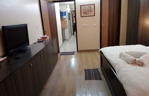 Spacious apartment nestled in the lap of Himalayas and Ganges. This apartment gives a beautiful view of the Gardens and Hills from the balcony. Very comfortable for 4 adults. It has 1 Bedroom with Double bed and 1 living room with sofa cum bed.