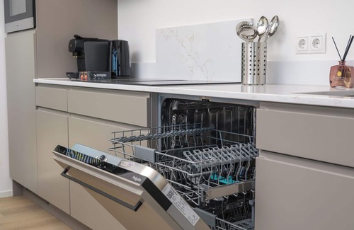 the 70 m² villa feels spacious and open thanks to the large windows In the living room, you will find a nice sitting area with a TV and a large dining table. The open kitchen is modern and complete, equipped with an induction stove with an integrated extractor, a combination oven, and a dishwasher – everything you need to cook together easily.