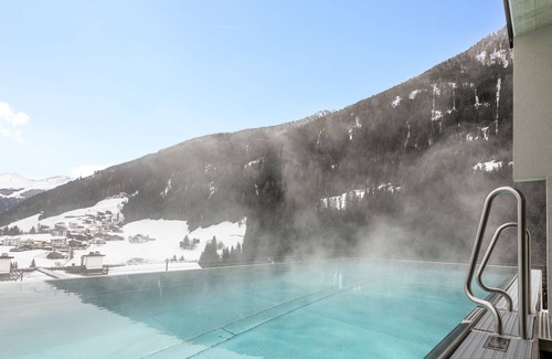 wake up to breathtaking mountain views in the luxurious adult only suite, perfect for four guests This top-floor suite offers two bedrooms, each with its shower and toilet, for ultimate comfort and privacy. Relax in the spacious living room with a cosy fireplace and panoramic windows. Enjoy the terrace overlooking the Tyrolean Alps, or dip in the infinity pool (accessible only from 16+ years). this is the perfect combination of luxury and nature for an unforgettable stay