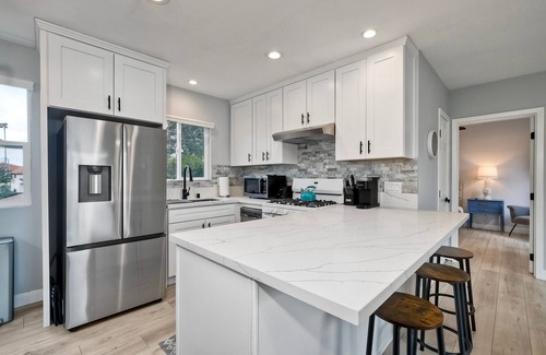 main unit (2br): step into a bright, open-concept layout with a fully stocked kitchen, dining area, and cozy living room complete with reclining leather sofa chairs A remote work setup makes this home perfect for extended stays or working vacations.