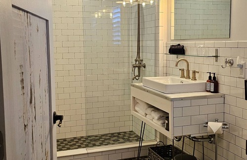 the cabin features a king-size bed adjacent to a sitting area with a twin sleeper sofa and a fully-equipped kitchenette with distressed wood cabinets, as well as a screened sleeping porch and a full-size tiled bath If you prefer, however, there is an additional outdoor shower. This cabin is perched on the edge of one of our apple orchards, and includes access to all 250 acres of the property.