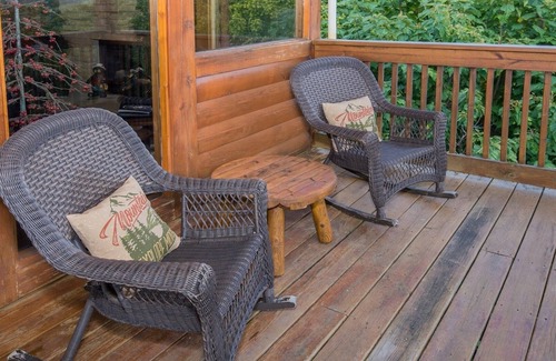 while you are out shopping at all the outlet malls, the guys can stay back at the cabin and enjoy the upstairs game room They will love the air hockey table, or playing a friendly game of pool on the full size pool table, and if that's not enough, play a game of darts, while you watch TV...When you are ready to unwind for the day, and watch the most beautiful sunsets you have ever seen, grab a glass of wine and head to the hot tub on the second level deck. You won't ever want to leave....and if it's just the two of you, the red heart shaped Jacuzzi tub will be a perfect way to end your day. The king size log bed in the master suite has luxurious bedding & high thread count sheets to ensure a great nights sleep. When you arise you will have a fabulous view of the misty mountains, and don't be surprised when you hear Dolly's train whistle, your only minutes to Dollywood..