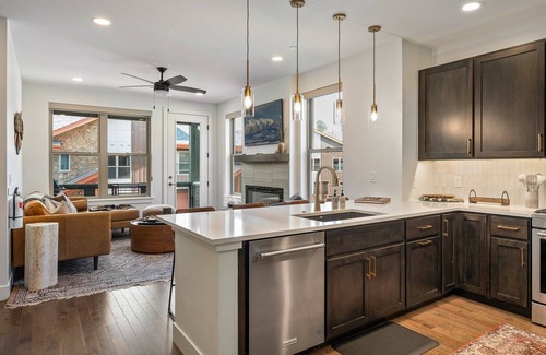 the ambiance of the home is warm and inviting, highlighted by a cozy gas fireplace in the living area, perfect for gathering around after a day on the slopes The fully equipped kitchen boasts modern appliances, including a refrigerator, stove/oven, dishwasher, and microwave, along with all the necessary dishes and utensils to prepare delicious meals. Enjoy your culinary creations in the dining area or step outside to the private deck for al fresco dining with stunning mountain vistas.
