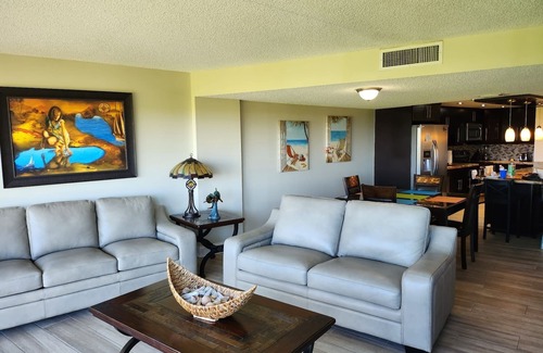 From your balcony in the Kawama Tower, you get stunning vistas of ocean and palm trees. Enjoy the view from this completely renovated fourth-story unit, while enjoying the luxury within. Enjoy the modern kitchen with granite countertops, tile, and all brand new appliances. The floors throughout the living area of this two-bedroom, two bath unit are brand new Travertine stone, making them not only comfortable, but clean and healthy. The unit is fully furnished with all the comforts of home, right down to the leather furniture in the living room.