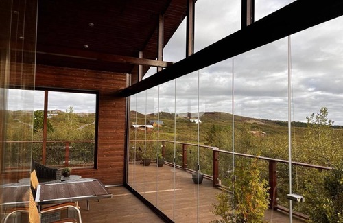 Miðengi is a new modern 3 bedroom luxurious villa located in Grimsnes, 45 min drive from Reykjavík. Its a walking distance from Kerið and 30 min away from Geysir, Gullfoss and Þingvellir.It was build in 2010 and is 97 square meters. The Property is very well equipped in every way, its surrounded by terraces, outdoor Jacuzzi, outdoor barbecue (gas), extra cost. garden furniture and the whole house is floor heated .There are three bedrooms all equipped with queen-size bed and a wardrobe, the master bedroom has a TV. The living room and the kitchen is one big area with large windows and a door to the terrace and a dining area for 8 people, TV and sofa. The kitchen is fully equipped, it has fridge, freezer, dish washer, spam stove tops and an oven. The bathroom is equipped with a shower and a door to the Jacuzzi. There is also a washing room which has an extra refrigerator. The Cottage has a Wi-Fi. up to 15 GB.