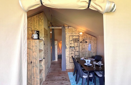 discover the perfect balance between adventure and comfort and stay in one of the beautiful safari tents at camping de vuurkuil in the veluwe The tent is suitable for four people, is very spacious and comfortably furnished, and has a kitchenette, bathroom, sleeping cabin with a double bed, and sleeping cabin with a bunk bed. at the front of the tent is a lovely terrace, where you can relax with a view of the camping field where the other five safari tents are also located