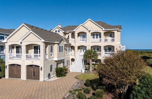 Welcome to Heels in the Sand, an iconic 9-bedroom, 10 full and 3 half bath luxury estate in the prestigious Pine Island community of the Outer Banks. This architectural masterpiece offers panoramic views of the Atlantic Ocean and Currituck Sound, all within a resort-style setting newly updated for 2025. Enhancements include new composite decks, fresh paint, energy-efficient windows and doors, a new roof, a resurfaced and re-tiled saltwater pool, and several brand-new kitchen appliances. Whether you’re lounging on the sun deck, soaking in the hot tub, or enjoying ocean breezes from the dune-top deck, this home is designed to deliver an unforgettable coastal escape.