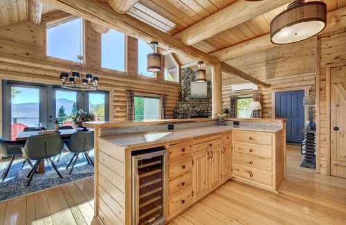 drive through the lodge's towering log gate and then immediately soak in the 360 degree waterfront and mountain views Next, enter the cabin on the 2nd floor which opens to the Great Room and kitchen. The wood burning fireplace towers over two dueling custom American made Bradington & Young distressed leather sofas, the finest hand made rugs, 10-person Restoration Hardware dining set + three barstools at the live edge bar- enough seating for everyone to enjoy meals together. The chef's kitchen has new Miele appliances and is fully outfitted with literally everything you will need to serve a gourmet meal to all of your party. No expense spared. The nearly 30ft tall great room is the main gathering spot and the best room for jaw dropping views. Off the great room is a wide wrap around deck with Adirondack chairs and the first of our two outdoor kitchens.