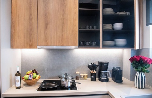 for those seeking ultimate relaxation, indulge in the apartment's luxurious amenities, including a sleek bathroom complete with a rejuvenating rainfall shower and premium toiletries For hot water, the apartment is equipped with a solar system. So, when it is sunny, you will always have hot water. If there is a cloudy day or there no sufficient heat water, there is a push button in the kitchen, where you can turn on the electrical boiler. After apx 40 minutes you will have again hot water, there is also an electrical towel rank where you can dry fast your towels.