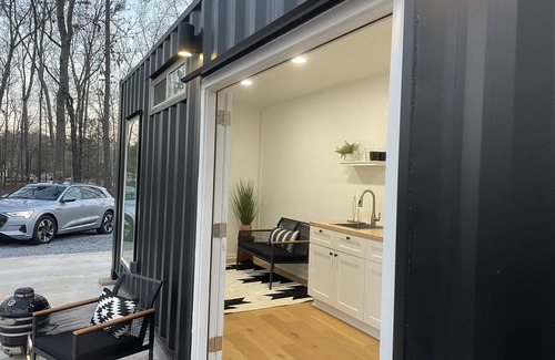 this modern luxury container home has it all: private bedroom, bathroom with a spa like shower, kitchen plus a living space! the space is cozy, but spacious with doors opening to deck with a fire pit and outdoor seating area with a grill Be sure to check out the trails! The sleek modern interior is a beautiful contrast to the peaceful wooded surroundings. The fully stocked kitchen includes a stove, countertop convection oven, microwave and refrigerator. K Cup coffee and coffee maker provided, and a drip coffee maker is available. You will find everything you need to make your stay enjoyable in the unique, but stunning converted container! Property still has trees down from recent hurricane, please be careful if you chose to walk the trails..