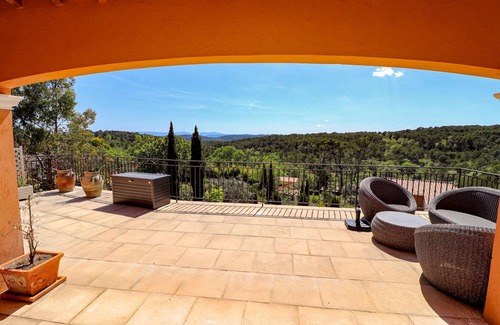 Villa Théia, located on an estate of no less than 2200 m², is accessible via a long driveway with an electric gate. There is parking for 6 cars (3 covered) and it offers its guests various luxurious facilities, from a private swimming pool to a jeu de boules court and beautifully landscaped, fully enclosed garden. Perfect for family holidays! Flayosc is a charming village in the beautiful Var region, hidden among the rolling hills of Provence. The village has a lively village square with cozy cafes and restaurants where you can enjoy delicious local specialties and wines. Flayosc is also an ideal base for exploring the nearby nature, such as the Gorges du Verdon and the Massif des Maures. There are many hiking trails that wind through the area. Via a staircase from the garden you reach the upper terrace with swimming pool (including walk-in steps), covered outdoor kitchen and spacious dining table. Ideal for fun evenings! This part can be closed with a gate. On the other side you will find the terrace off the living room with a cozy lounge area, and always with that beautiful view over the green hills and valleys. Indoors there is a spacious living room with fireplace, TV, WiFi, Chromecast and music system via Bluetooth. The open kitchen in Provencal style is equipped with all amenities. All bedrooms are very comfortable and air conditioning provides cooling on hot summer days. The downstairs bedrooms have French doors to the garden. The swimming pool can be heated optionally and on request, outside the months of July and August, for 100 euros per week.